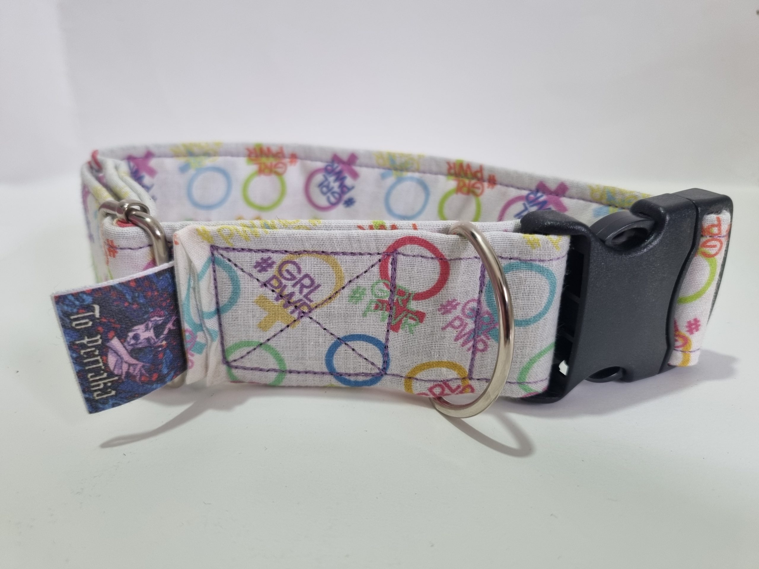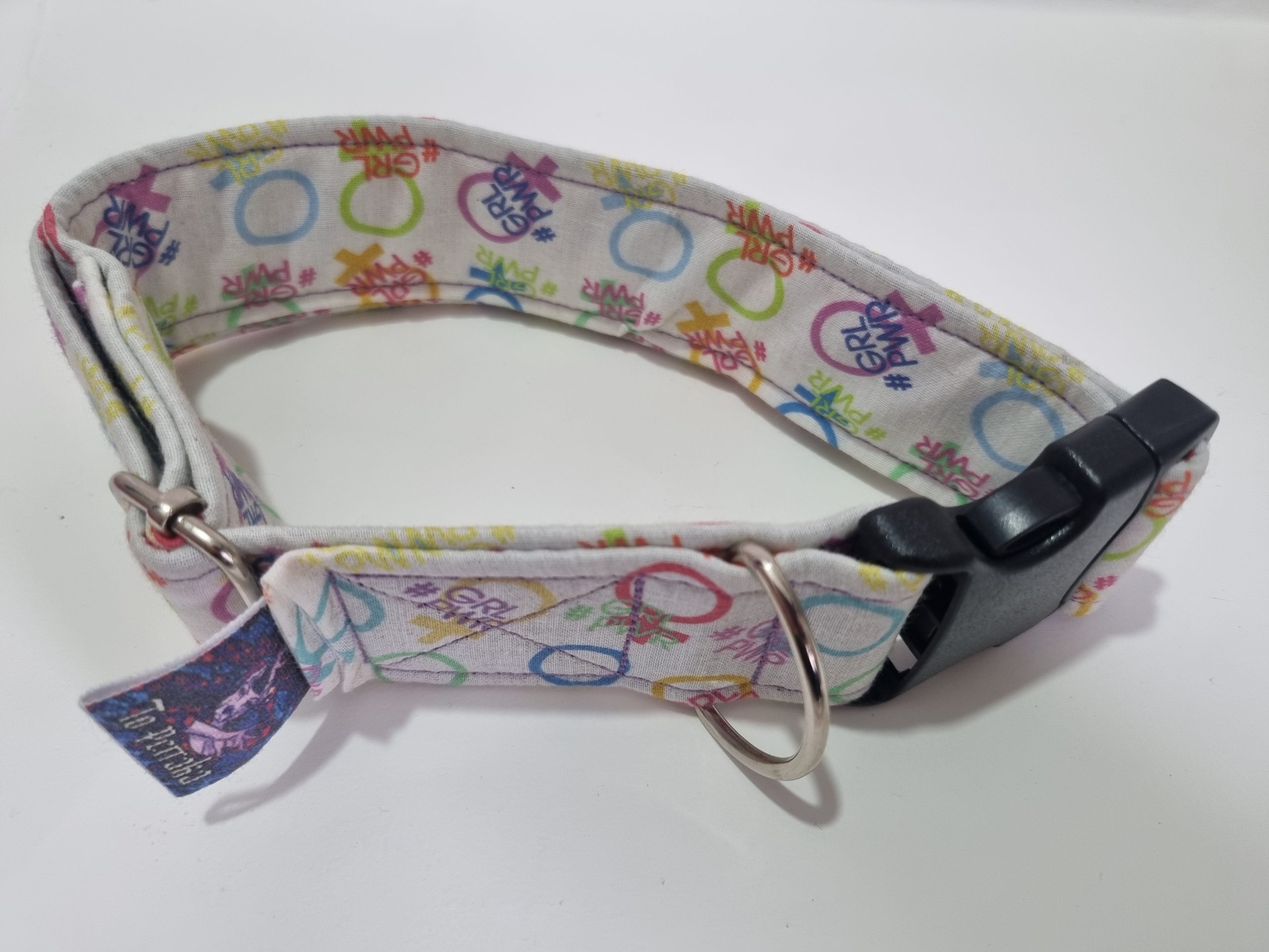 Collar de perro ajustable de tela de colores. Cierre de plástico negro y ajustable y anilla en acero inoxidable.