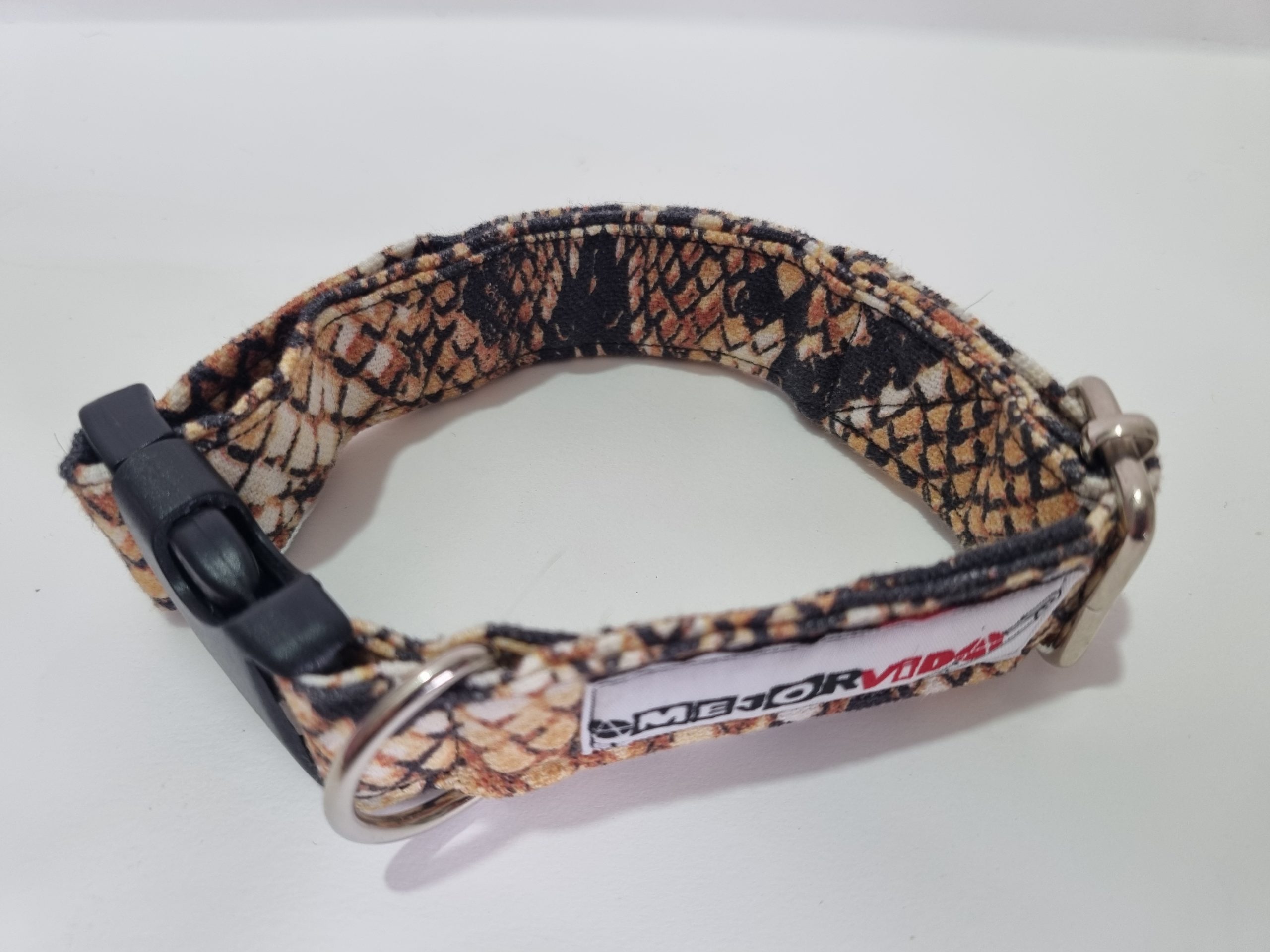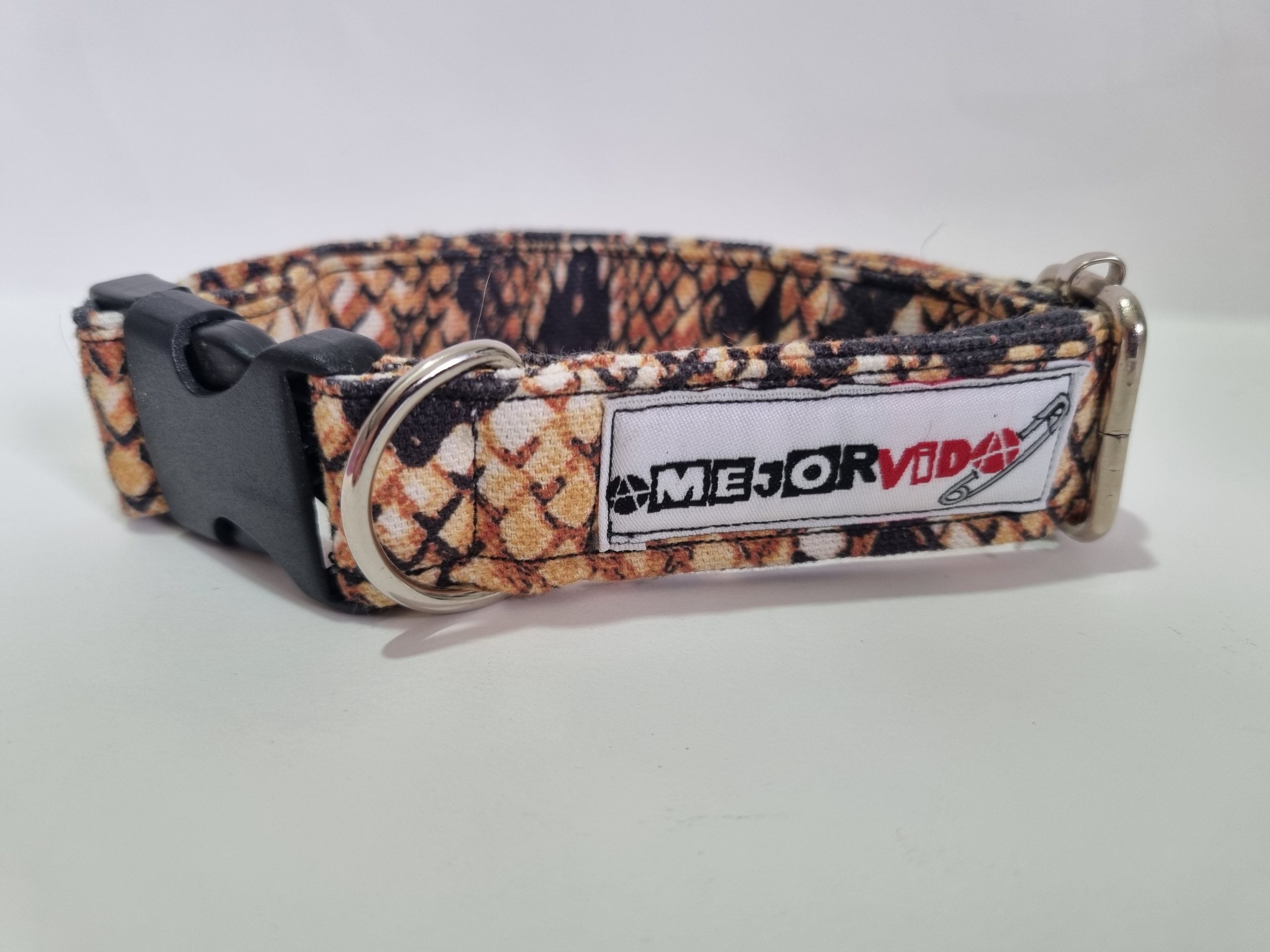 Collar de perro ajustable con tela de estampado étnico y de colores. Cierre de plástico negro y ajustable y anilla en acero inoxidable.