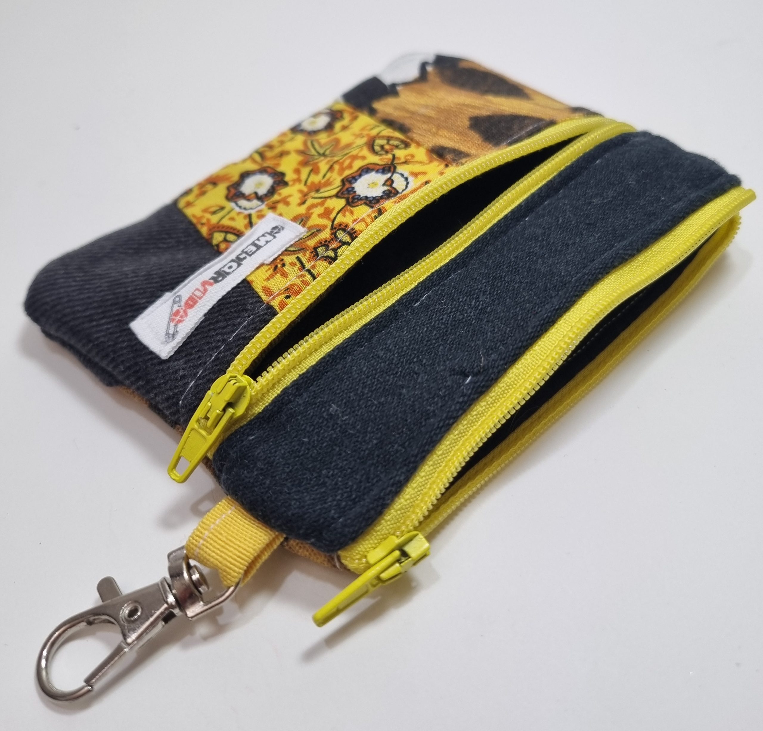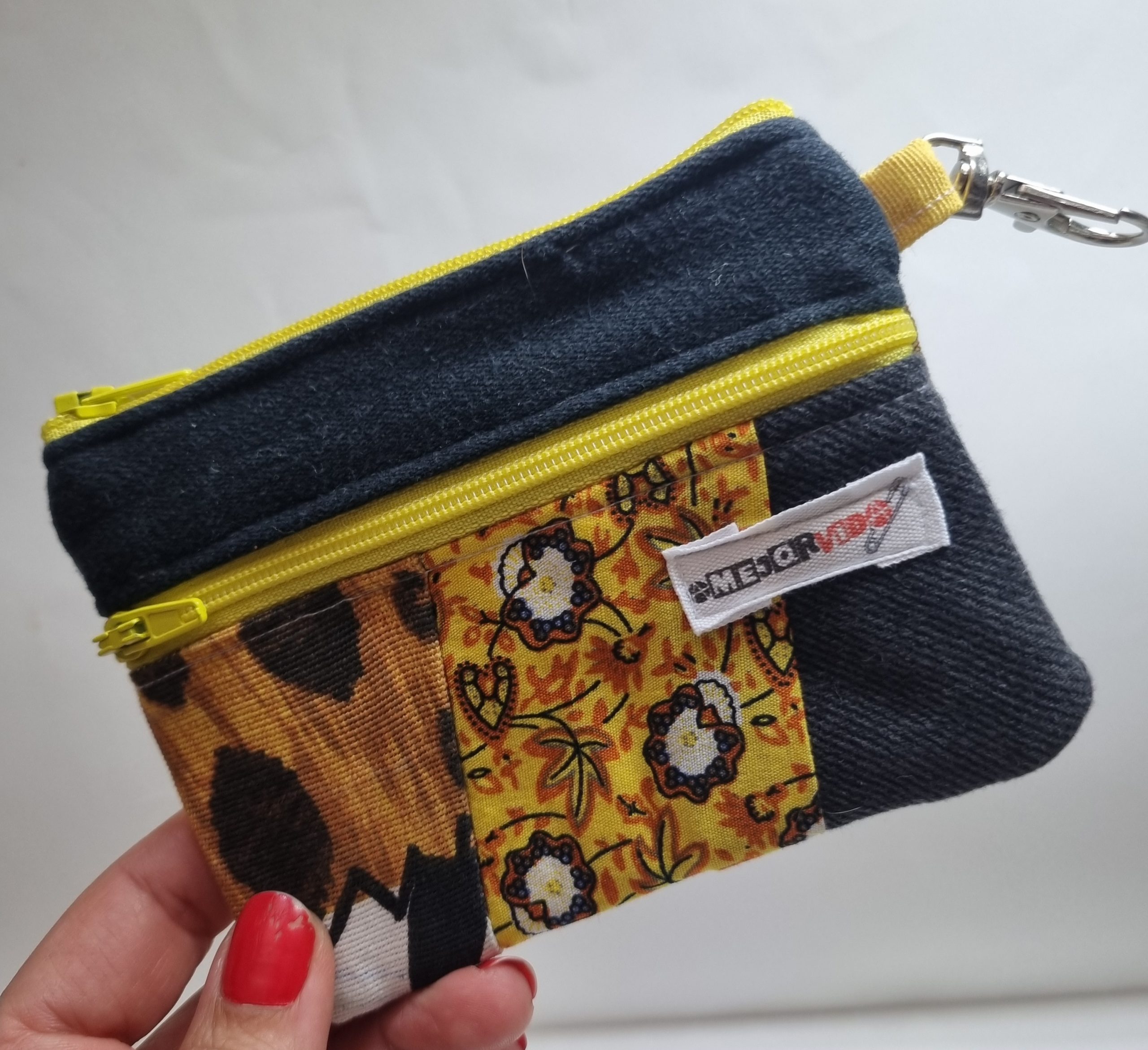 Los Monederos Retaleros están hechos 100% a mano con retales de telas sobrantes, destripamiento de prendas en buen estado y otras telas en desuso donadas. Tienen dos apartados con cremalleras en las que, en ambos, caben tarjetas, monedas y billetes. También cuenta con un enganche en el exterior para poner tus llaves.