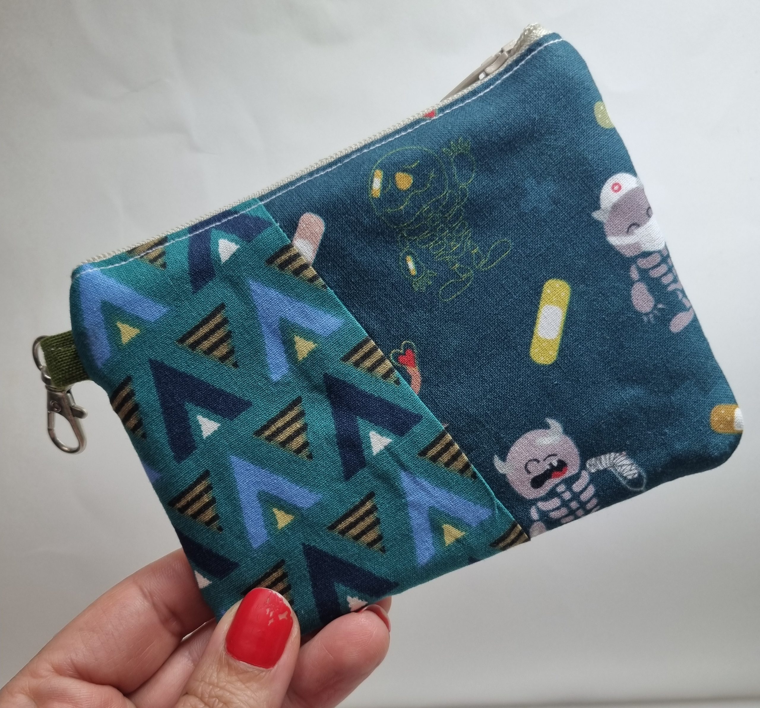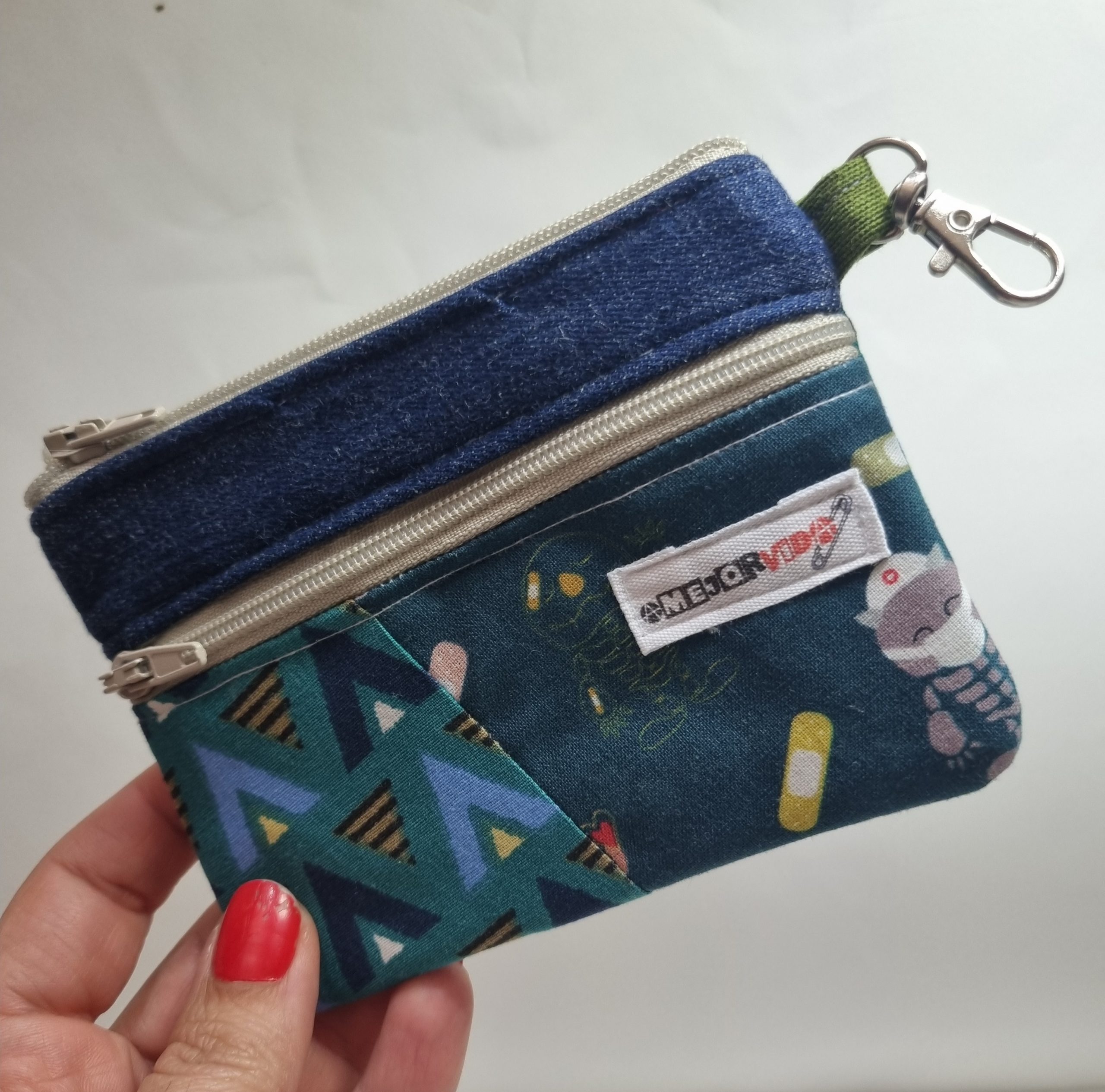 Los Monederos Retaleros están hechos 100% a mano con retales de telas sobrantes, destripamiento de prendas en buen estado y otras telas en desuso donadas. Tienen dos apartados con cremalleras en las que, en ambos, caben tarjetas, monedas y billetes. También cuenta con un enganche en el exterior para poner tus llaves.